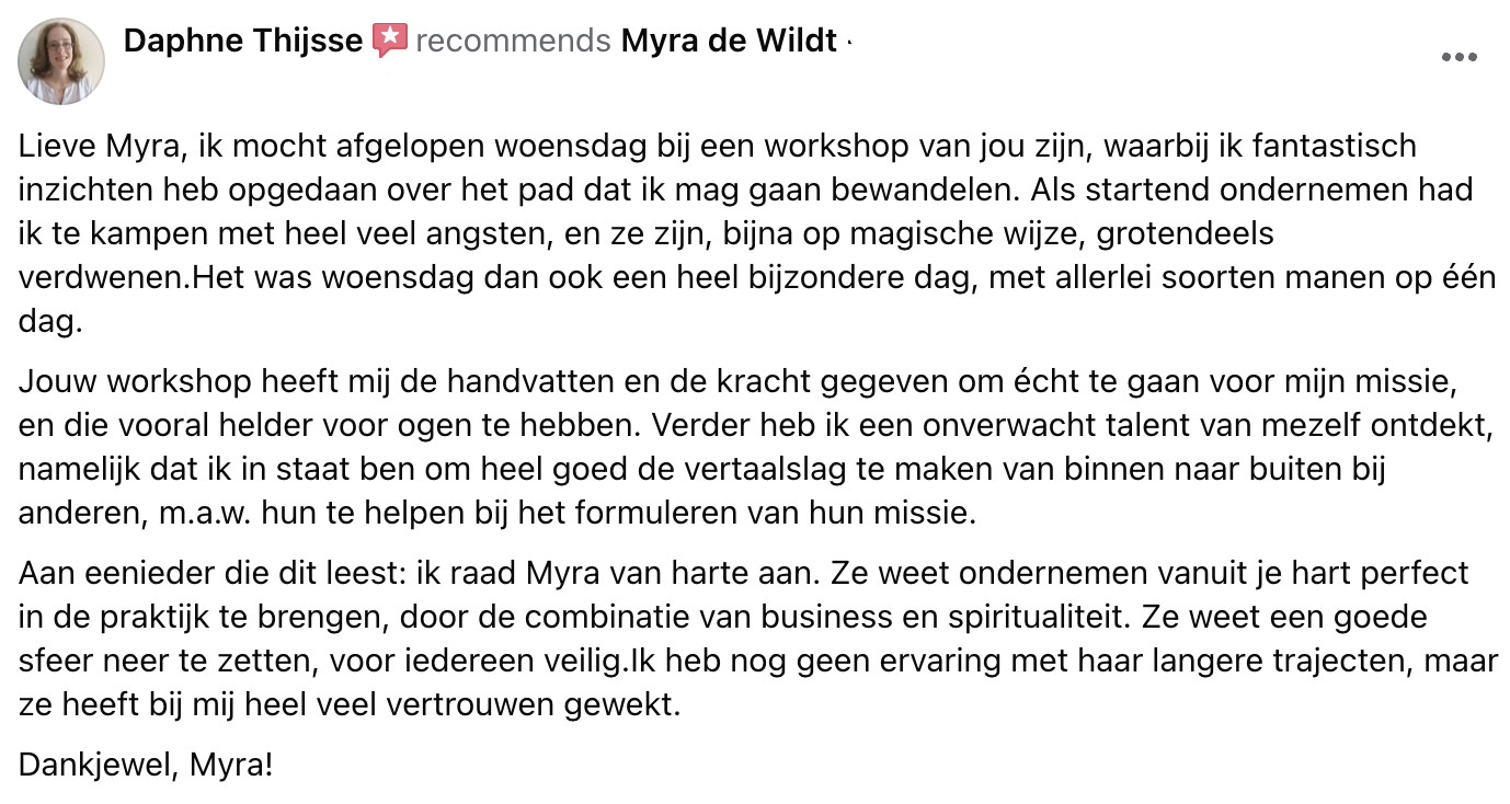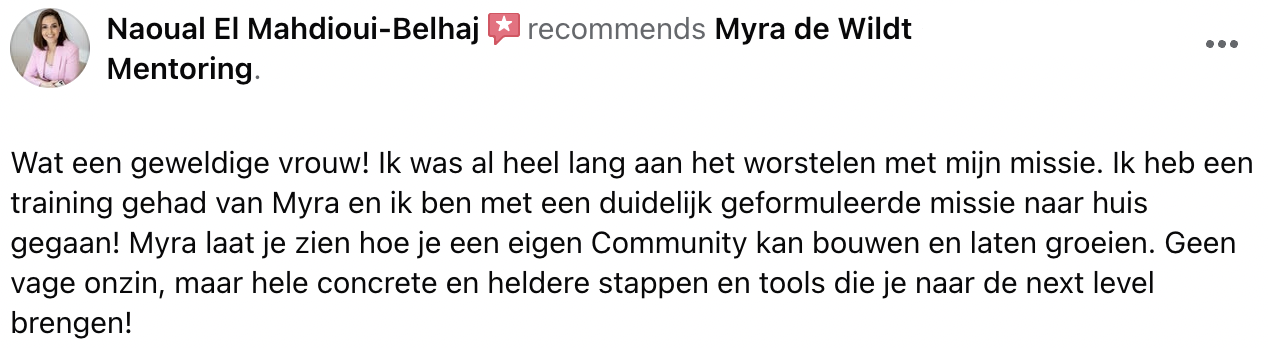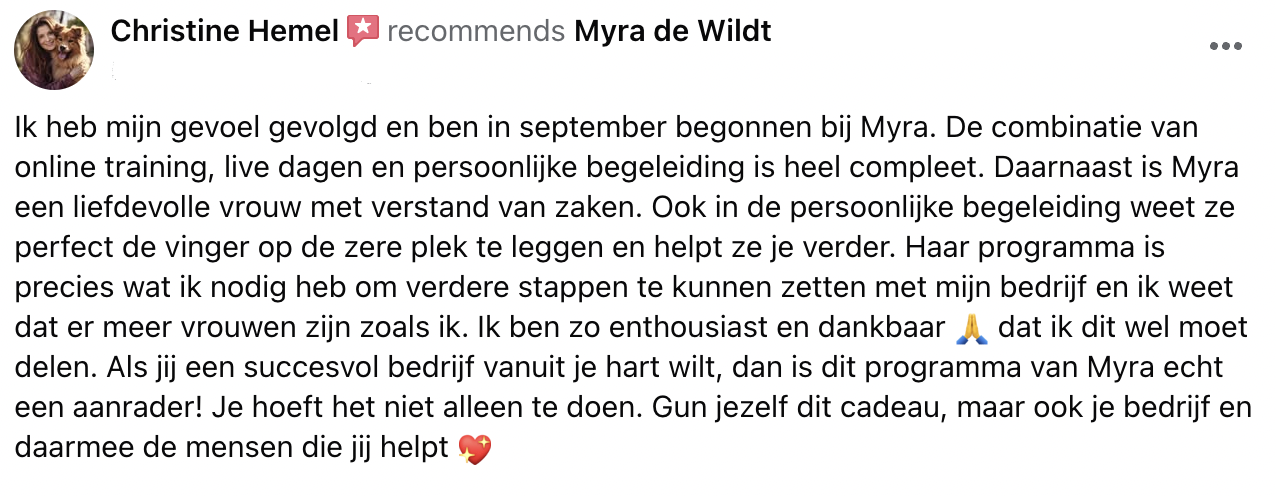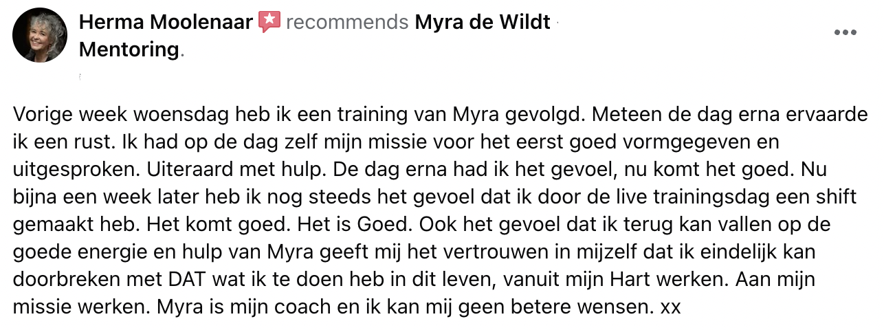 Ik ben ontzettend dankbaar dat Myra op mijn slechtste moment in mijn leven op mijn pad gekomen is.. het is echt een Powervrouw, met zoveel liefde voor haarzelf en anderen. Het geeft veel hoop en vertrouwen voor mijn toekomst. Ze is super mooi voorbeeld voor ons vrouwen dat er echt hoop is en dat we de liefdespijn om kunnen zetten in “echt” gelukkig zijn. Ik ben het bewijs!